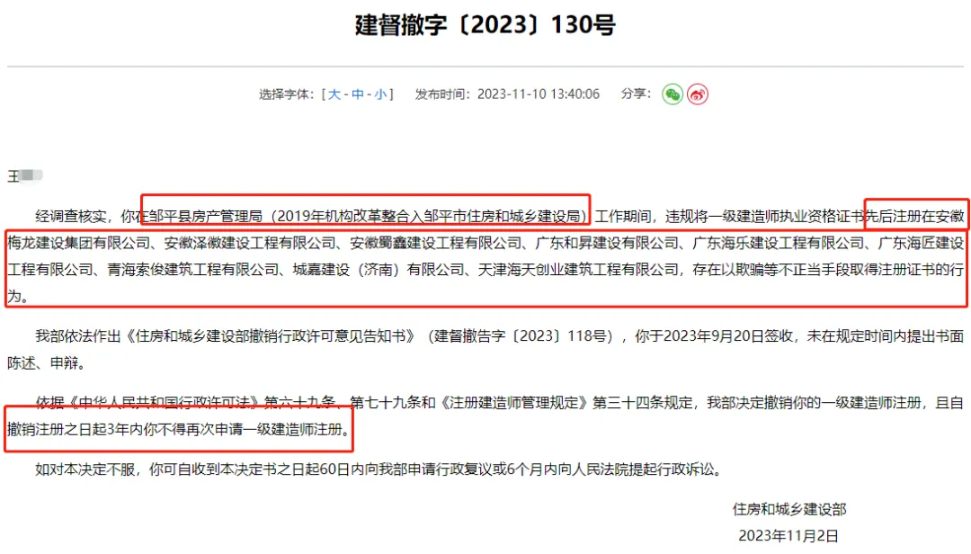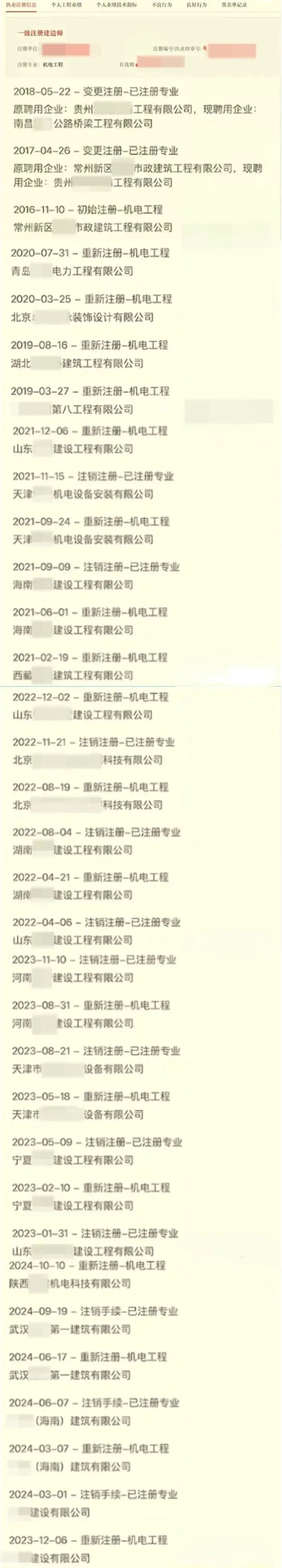 一建“挂证女王”,8年注册了23家单位,跨越多省市! 发布: 2025 年 4 月 10 日 287阅读 有位持机电专业的一级注册建造师,注册轨迹被拉出来示众了。 她在8年内先后注册了23家公司, 证书足迹遍布大江南北:贵州、西藏、海南、常州、北京、湖北、山东、天津、湖南。 16年-18年,每年注册 1家 单位; 19年-20年,每年注册 2家 单位; 21年-24年,每年注册 4家 单位; …… 从一开始的小心翼翼,再到尝了甜头后,胆子越来越大,短期注册越来越频繁,轨迹遍布中国大江南北。 这位“持证人”已经被相关部门拉入了黑名单。 证书的注册轨迹,越来越关系到证书安全与否。 住建部早前公布的一建挂证处罚通知里,绝大部分都是频繁换注册单位,差不多人均5-7家吧,其中一个甚至换了9家企业。 两年一换可能还算正常,一年两三换,这么频繁,这么明显的“异常”,你就说应不应该查吧。 本文来自网络,不代表机电天下立场,转载请注明出处:https://mepbbs.com/archives/14299 标签:挂证女王
