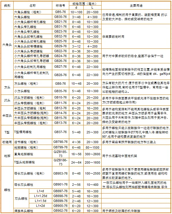2.当机械性能(强度级别)的分级的规定不能满足使用要求时,可按需要选用材料。对T型、活节等螺栓的材料在相应标准中有规定。