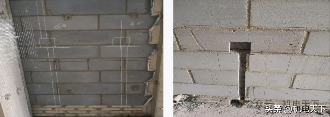砌体结构开槽配管:待砌筑强度达到要求,贴完灰饼或冲筋后,抹灰前采用激光水平仪定位,对开槽范围进行弹线,采用专用开槽机开槽,同时控制开槽深度。