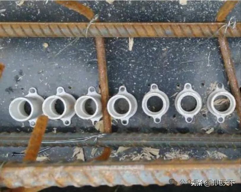 1.线管下翻,采用塑料定位模具(圆形橡胶模具),模具直径按对应规格线管直通接头内径尺寸进行制作,将模具固定于梁模板,右侧照片为拆模后的效果。