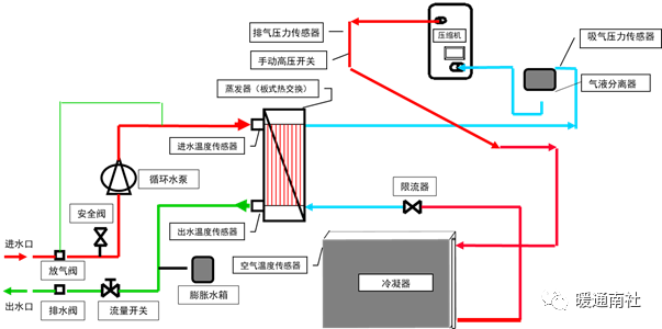 安装于板式热交换器出水管路上,没有水流或流量过低时,将不允许压缩机及循环水泵运行。
