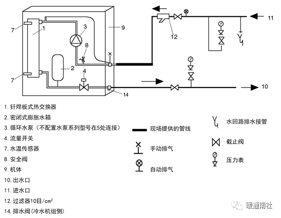 必须在水的进口处安装网眼至少10目的过滤器,避免对机组水路的堵塞;