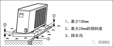 对于热泵型空调,必须将其安装在地板以上足够高度的地方。在制热模式工作时,为将凝结水排入排水沟,可将排水接头插到底盘左下方的孔中,并装上一根内径为16mm的乙烯塑料管。