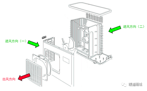 空气在室外电机带动轴流风叶的作用下,由机组正左侧(进风方向一)及正后方(进风方向二)进入,穿透换热器翅片间隙完成热量交换,途径由顶盖板、中间隔板、风圈、前面板组成的风道,最终穿过出风隔栅,从机组正前方吹出。