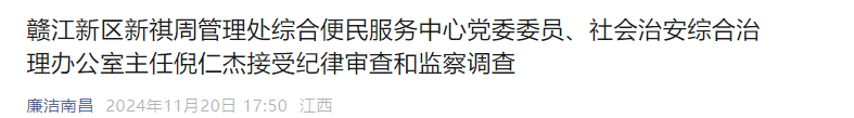 此前,据廉洁南昌消息:赣江新区新祺周管理处综合便民服务中心党委委员、社会治安综合治理办公室主任倪仁杰涉嫌严重违纪违法,目前正接受赣江新区纪检监察工委纪律审查和南昌市青山湖区监委监察调查。