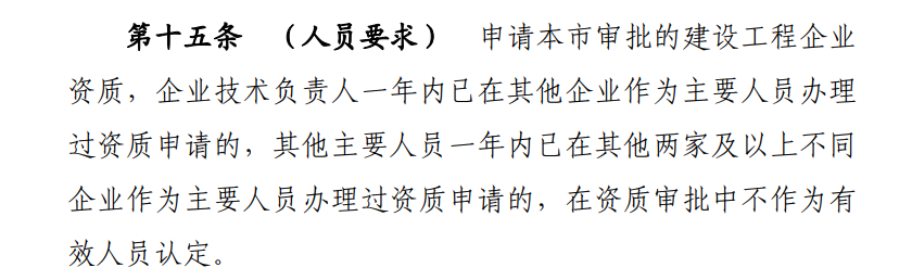 第十五条 (人员要求) 申请本市审批的建设工程企业资质,企业技术负责人一年内已在其他企业作为主要人员办理过资质申请的,其他主要人员一年内已在其他两家及以上不同企业作为主要人员办理过资质申请的,在资质审批中不作为有效人员认定。