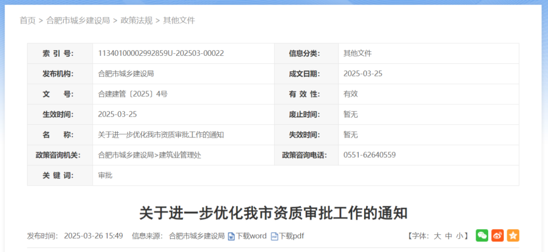 2025年3月,合肥市住建局发布《关于进一步优化我市资质审批工作的通知》(合建建管〔2025〕4号)