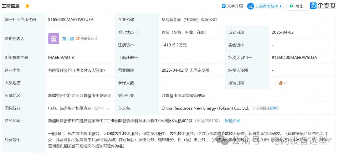 由华润新能源投资有限公司100%持股,这意味着华润将大举布局新疆新能源市场。