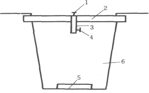 1-中心钉;2-坡度板;3-高程板;4-高程钉;5-管道基础;6-沟槽