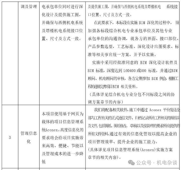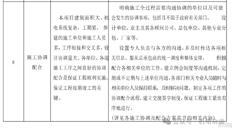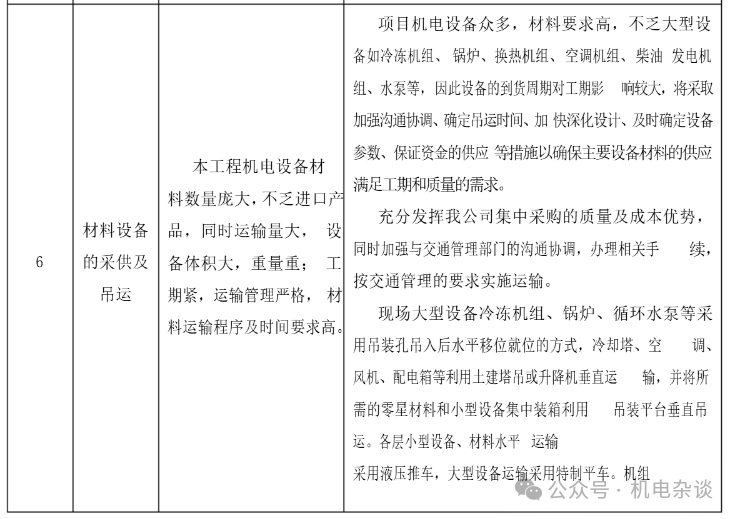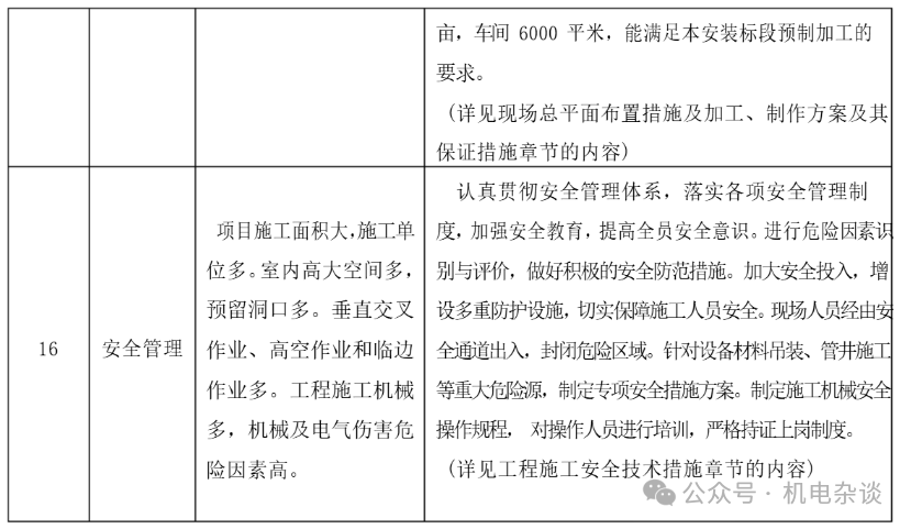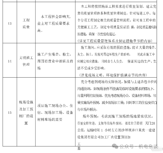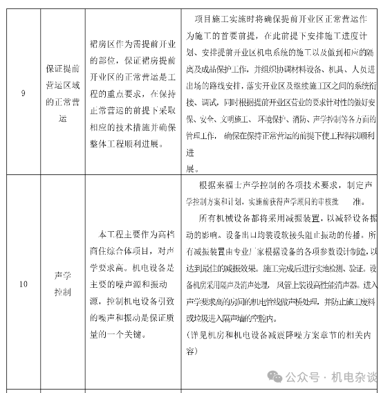 针对商业综合体工程机电安装的特点和要求,通常将下面几点作为施工管理重点及难点,采取应的措施。下面以某商综项目为例,分享该项目施工前对机电安装施工重难点的针对性整理,见下表。