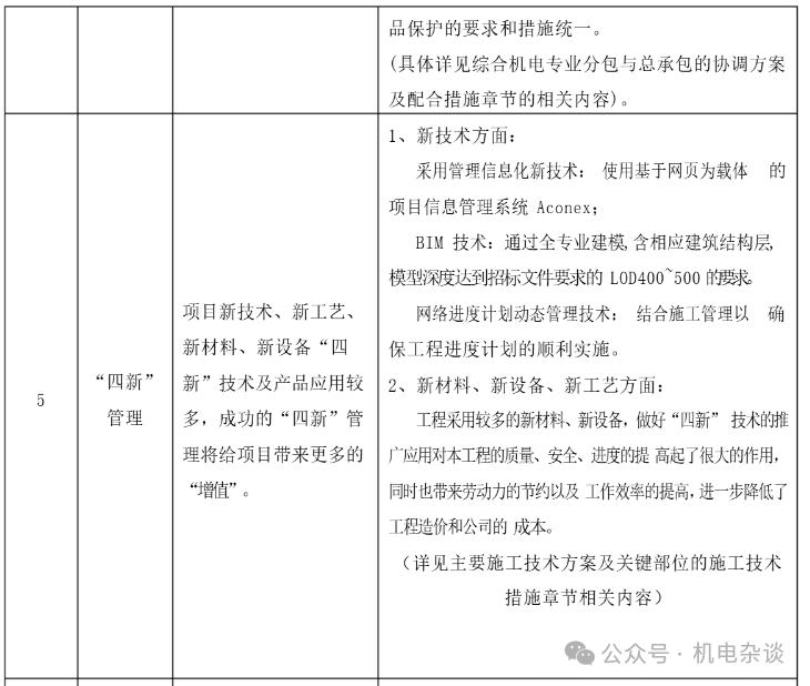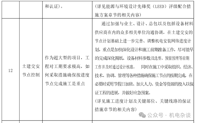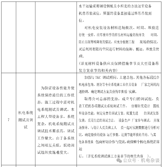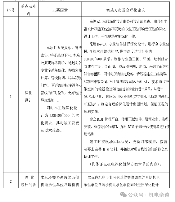 某商综项目投标阶段的机电安装工程重难点分析及相应对策列表: