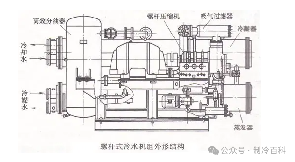 螺杆机组包括:螺杆式制冷压缩机、管路系统、油路系统和控制系统、这些设备(除启动柜之外)装在同一公共底座上,构成机组。