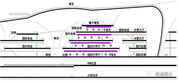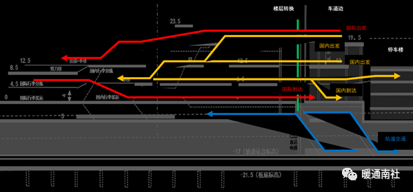 四层国际安检,三层国内安检,二层国内行李厅,首层国际行李厅;