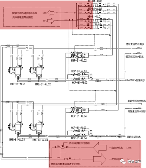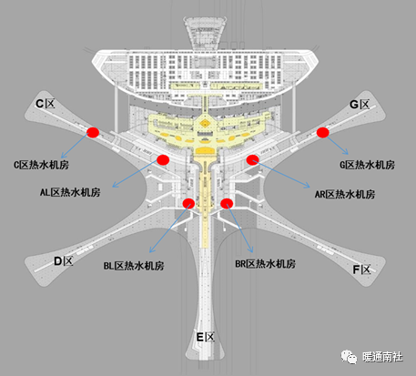 中心区、C指廊CIP及G指廊计时酒店集中生活热水系统采用集中热水系统。热 源为全年冷空调机组的冷凝热,热水供回水温度为55/50℃。冬季辅助热源为场区热力。