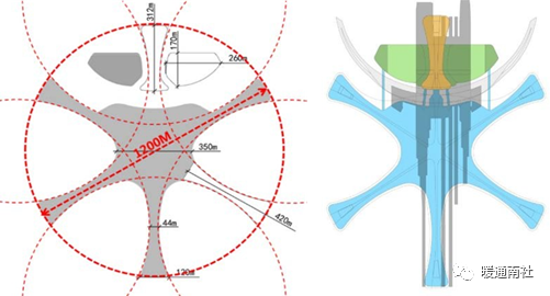 航站楼及综合换乘中心约78万m2;停车楼约25万m2;综合服务楼约13万m2;总体构型包络于一个1200米直径的正圆之内;航站楼地上五层、地下两层;航站楼高度约50m。