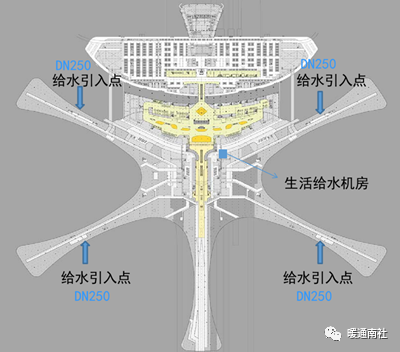 航站楼供水水源由机场规划新建的的自来水厂提供航站楼陆侧供水干管敷设在 航站楼东西两侧的管廊内空侧的供水干管沿航站楼周边直埋敷设,管径为DN500。