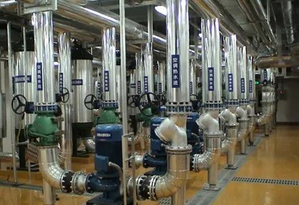 空调机房施工:设备及配管位置正确、合理,排列整齐;管道保温采用铝壳外包保护,大气、美观、适用;排水沟设置合理。