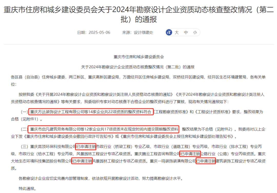 第二,监管力度越来越大,通过资质动态核查,对企业进行全流程监督。就在天津城建受罚当天,重庆市还公布了 2024 年勘察设计企业资质动态核查整改情况。14 家企业整改合格,12 家没通过,还有几家直接放弃整改,资质被注销了。虽然这次不合格的大多是乙级、丙级资质企业,但这也说明,以后资质审核只会越来越严,靠 “挂证” 撑场面的日子,彻底过去了;