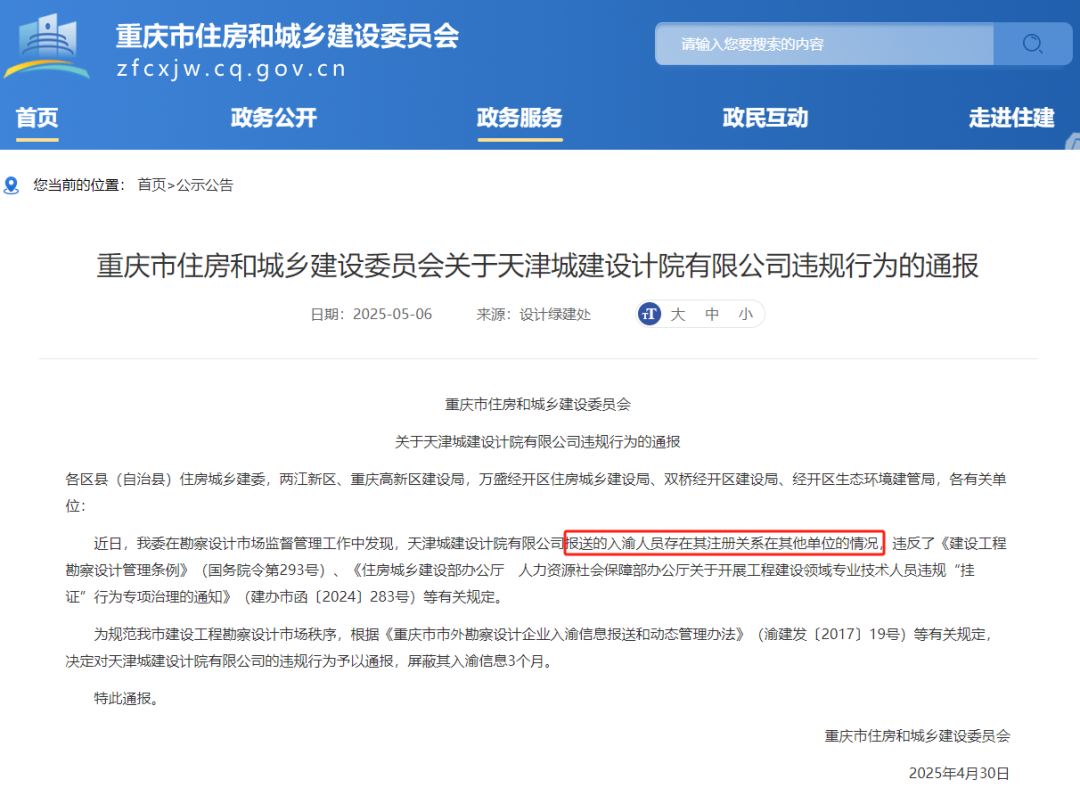 五一后的第一个工作日,重庆市住房和城乡建设委员会发布了一则处罚通告,天津城建设计院有限公司因为注册人员 “挂证”,被禁止在重庆承接业务三个月。