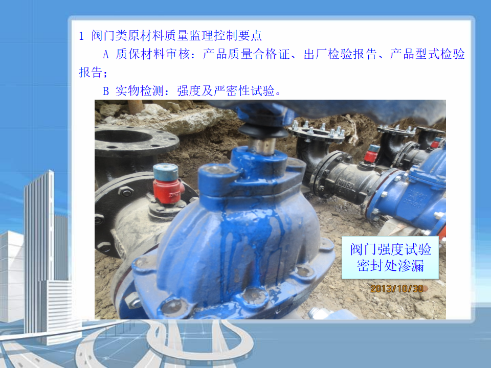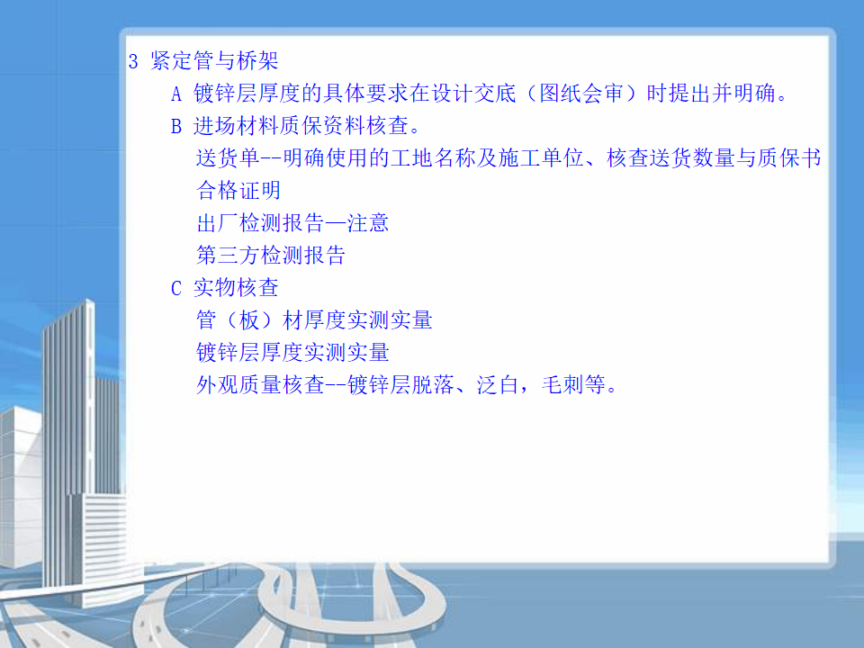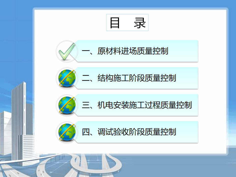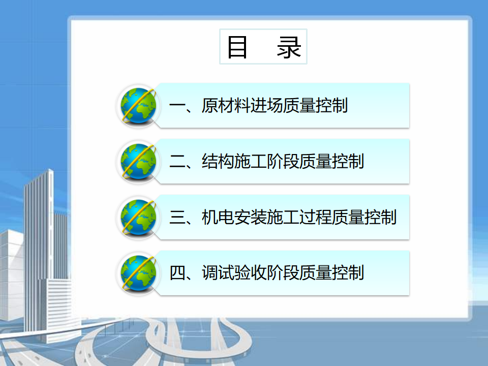 目录:一、原材料进场质量控制 ;二、结构施工阶段质量控制;三、机电安装施工过程质量控制;四、调试验收阶段质量控制 。