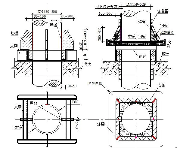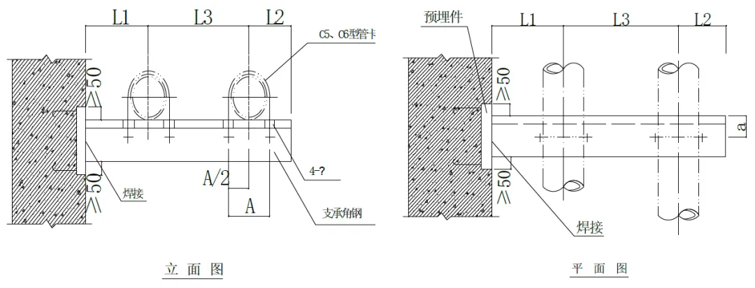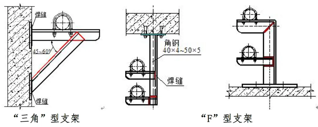 1)支吊托架位置应合理,埋设应平整牢固。管道在距转弯处200-300mm、距三通、四通分支处200-300mm应设置支吊架;支吊架应离开焊缝不小于50mm。支吊架尽量安装在梁、柱、墙承重结构上,安装在楼板上时应不大于楼板允许的负荷。大型阀门应单独设支架。