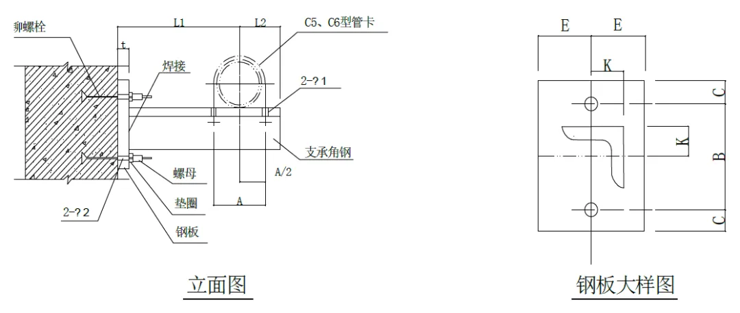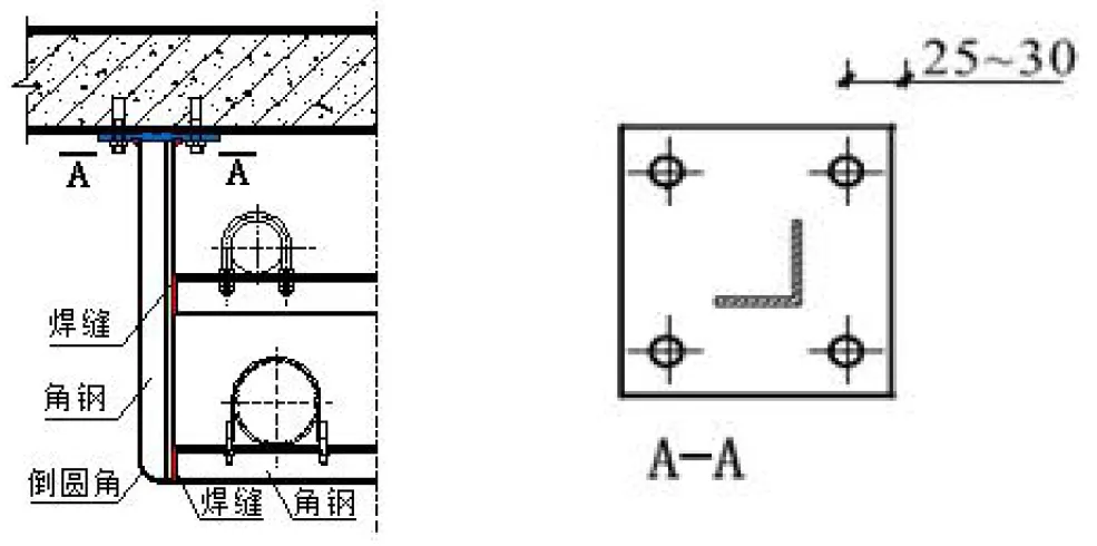 17)采用膨胀螺栓加钢板作为受力点时,选择膨胀螺栓规格、型号、抗拉、抗剪强度应满足管道、设备负荷要求,膨胀螺栓个数经计算选择。螺栓距钢板边沿尺寸应为25~30mm,受力根部应加垫片。