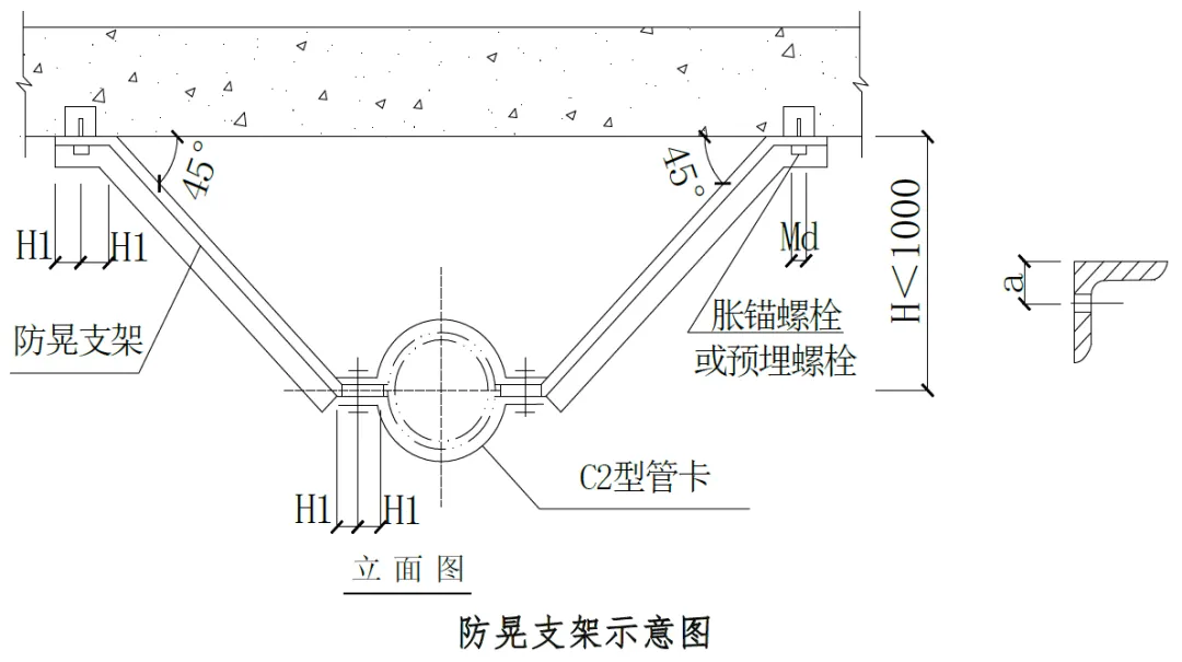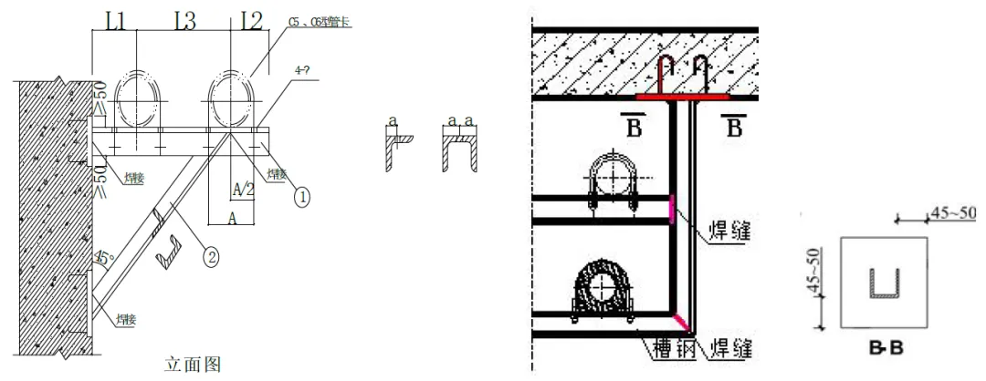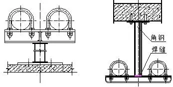 2)支吊架加工制作应机械切割钻孔,孔径为螺栓直径+2mm;支架端部打磨光滑、倒圆弧角,倒角半径为型钢端面边长的1/3~1/2,支架拐角处应采用45°拼接焊接,焊缝应饱满、打磨平滑。