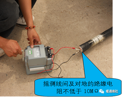 电缆电线敷设:电缆敷设前用1KV摇表遥测线间及对地的绝缘电阻应不低于10MΩ;电缆敷设完毕,送电前须分别对电缆进行绝缘电阻遥测;