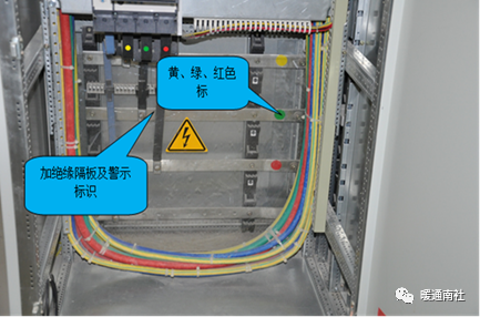 配电柜内标识:配电柜接线铜排,必须张贴黄、绿、红、蓝色标及警示标识;配电柜接线铜排,必须安装安全隔栅板;分相电缆要套热缩管,不能裸露铜导线。