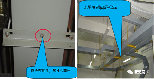 2)支架间距不得大于2米,支架须与桥架固定,并且螺栓头向外。