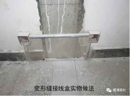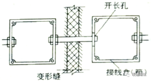 变形缝两侧各预留一个接线箱,先把管的一端固定在接线箱上,另一侧接线箱底部的垂直方向开长孔,其孔径长宽度尺寸不小于被接入管直径的2倍。