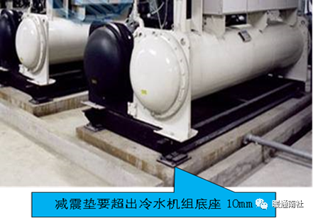机组安装减震垫必须采用优质、整块减震垫,减震垫尺寸大于冷机垫铁尺寸,减震垫超出冷水机组底座10mm。