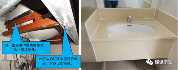 台下盆安装时要垫橡胶垫,防止损坏瓷器,台下盆的托架必须可拆卸,方便以后检修。