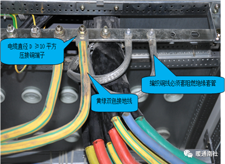 配电箱柜内接地线压接:在配电箱柜内明确地排位置,端子与螺栓应匹配;接地线必须为黄绿双色线,编织铜线必须套阻燃绝缘套管,回流排螺栓外漏。