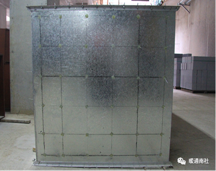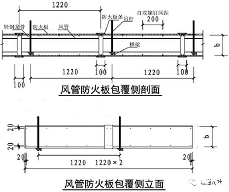 风管穿过防火隔墙、楼板、防火墙时,风管上防火阀两侧各2米的范围需要包覆纤维增强硅酸盐防火板,采用密度50kg/m3,厚度50mm的复合硅酸镁板高强度防潮、防火双层加肋铝箔,厚度为0.5mm;外包9mm厚纤维增强硅酸盐防火板。