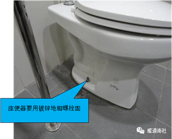 坐便器要用镀锌地脚螺栓固定,且应有橡胶垫片和安全帽。
