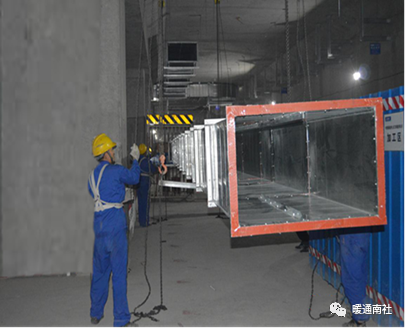 风管组装长度不超过10米,避免风管吊装变形。吊装点设置合理、牢固,不少于4个,倒链性能安全可靠。整体吊装时,两端速度应同步。