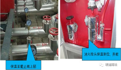 表弯、自动排气阀要保温到位。消火栓栓头和自救卷盘短管电伴热保温棉要保温到位,并且要保证消火栓栓头可灵活转动。