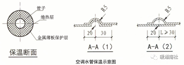 1、空调冷冻水管保温采用64kg/m3的离心玻璃棉壳、厚度为50mm,保温管壳外包防潮层,防潮层采用高强度防潮、防火双层加肋铝箔,厚度为0.5mm;外包保护层,保护层采用0.5mm厚热浸镀锌钢板。