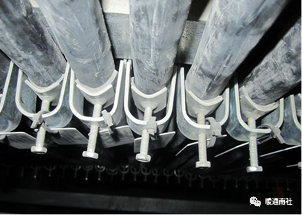风机吊杆穿横担采用裸母限位,横担下方配双螺母加平垫、弹垫。