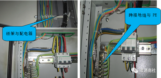 2)桥架首末端的接地端子要用爪型垫片且跨接地线配电箱柜PE排接线端子可靠联结,PE排螺栓弹垫、平垫齐全。