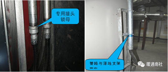 导管与接线盒连接时,接线盒内外均有锁紧螺母,露出锁紧螺母的丝扣为2~4扣,镀锌钢管跨接采用≥4mm²多股软线跨接,多股软铜线需涮锡并用接地卡固定,跨接地线应压接在接地卡子沟槽内,并弯回头。
