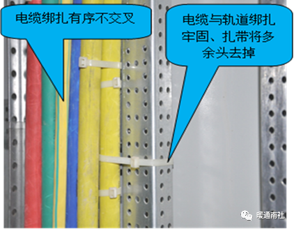 配电箱、柜安装:进柜电缆沿配电柜两侧轨道按顺序依次绑扎牢固,电缆不交叉;电缆间隔200mm用扎带绑牢,并将多余部分剪掉。