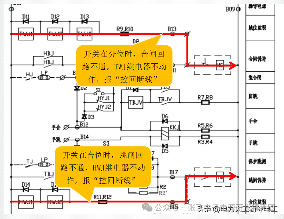 如果控制回路出现问题,这时会导致跳、合闸回路均不通,即TWJ、HWJ继电器回路均不动作,这时必须要有一个信号发出,以便及时发现和处理故障。这个提示控制回路有问题的信号便是“控制回路断线”,简称“控回断线”,实际运用中将TWJ和HWJ继电器的常闭接点串联开入发出“控回断线”信号。
