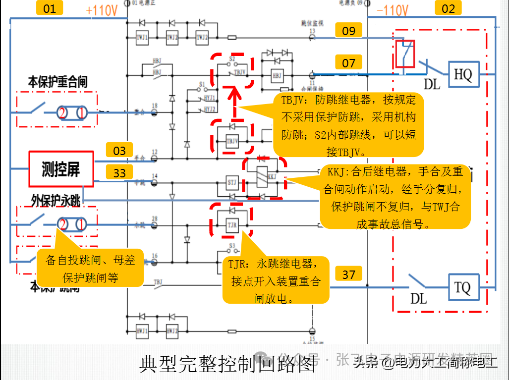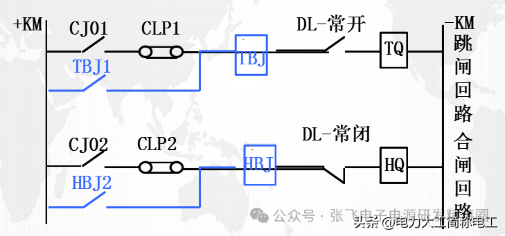 蓝色的部分为保持回路,如果保护动作发跳闸命令,跳闸回路导通,TBJ励磁,TBJ1吸合,此时即便CJ01断开,回路仍可经 “TBJ1-TBJ继电器-DL-常开接点-TQ线圈”导通直至断路器成功跳闸
