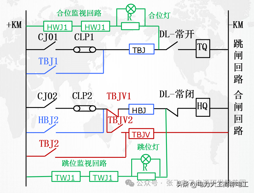 为了可以能时刻监视分、合闸回路是否出现异常,所以在控制回路中增加监视回路,用于监视分、合闸回路是否完好,同时可以显示开关的分、合闸位置,如下图绿线所示: