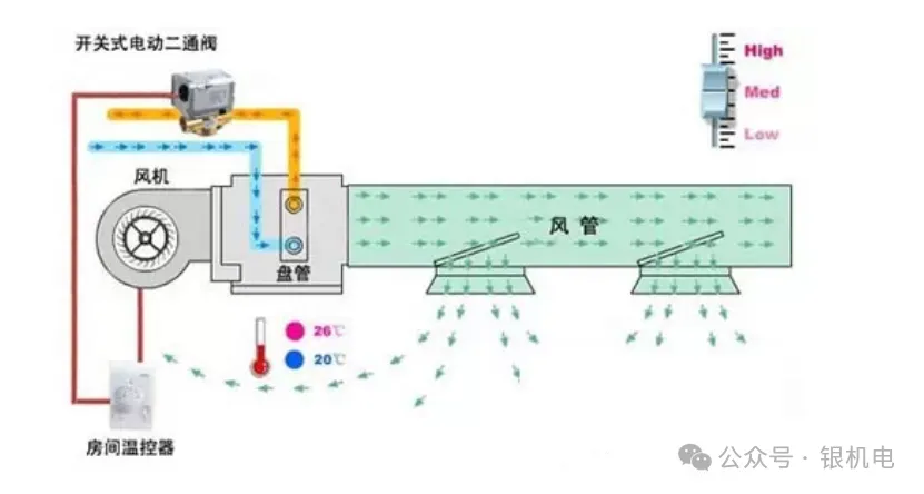 风机盘管简单控制:使用三速开关直接手动控制风机的三速转换与启停。