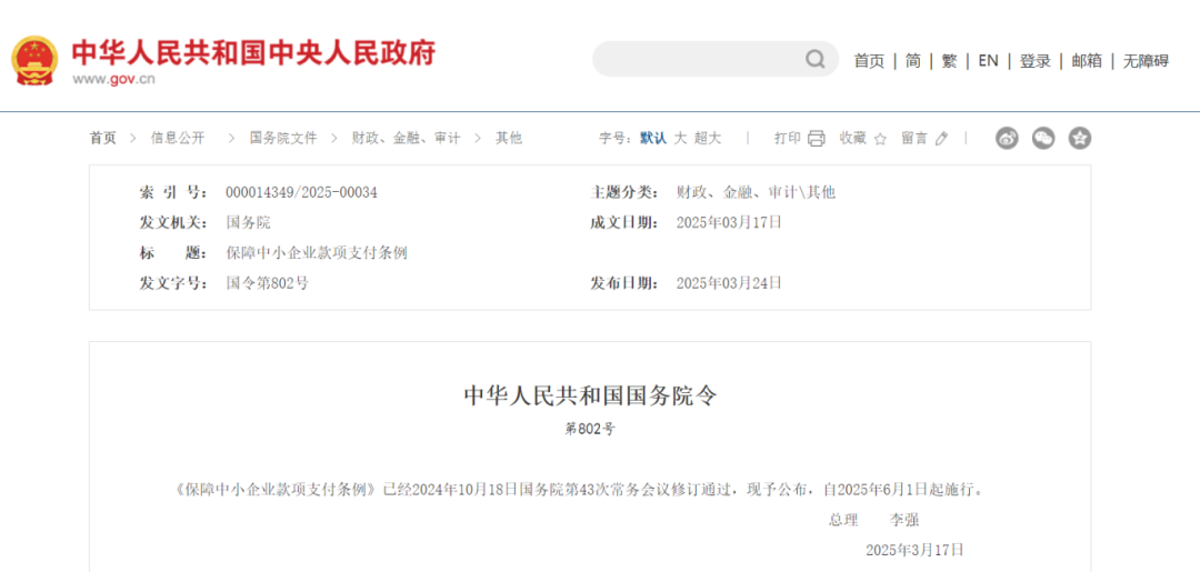 《保障中小企业款项支付条例》已经2024年10月18日国务院第43次常务会议修订通过,现予公布,自2025年6月1日起施行。
