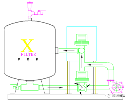 循环水由系统从砂滤器水泵入口进入,通过左上角常开电动阀,循环水由上排管到85#滤砂,再475#滤砂过滤后,从下排管经过右下角电动阀,过滤水回到系统中。