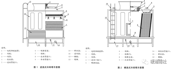 按热水和空气的流动方向分有逆流式冷却塔、横流(交流)式冷却塔、混流式冷却塔。
